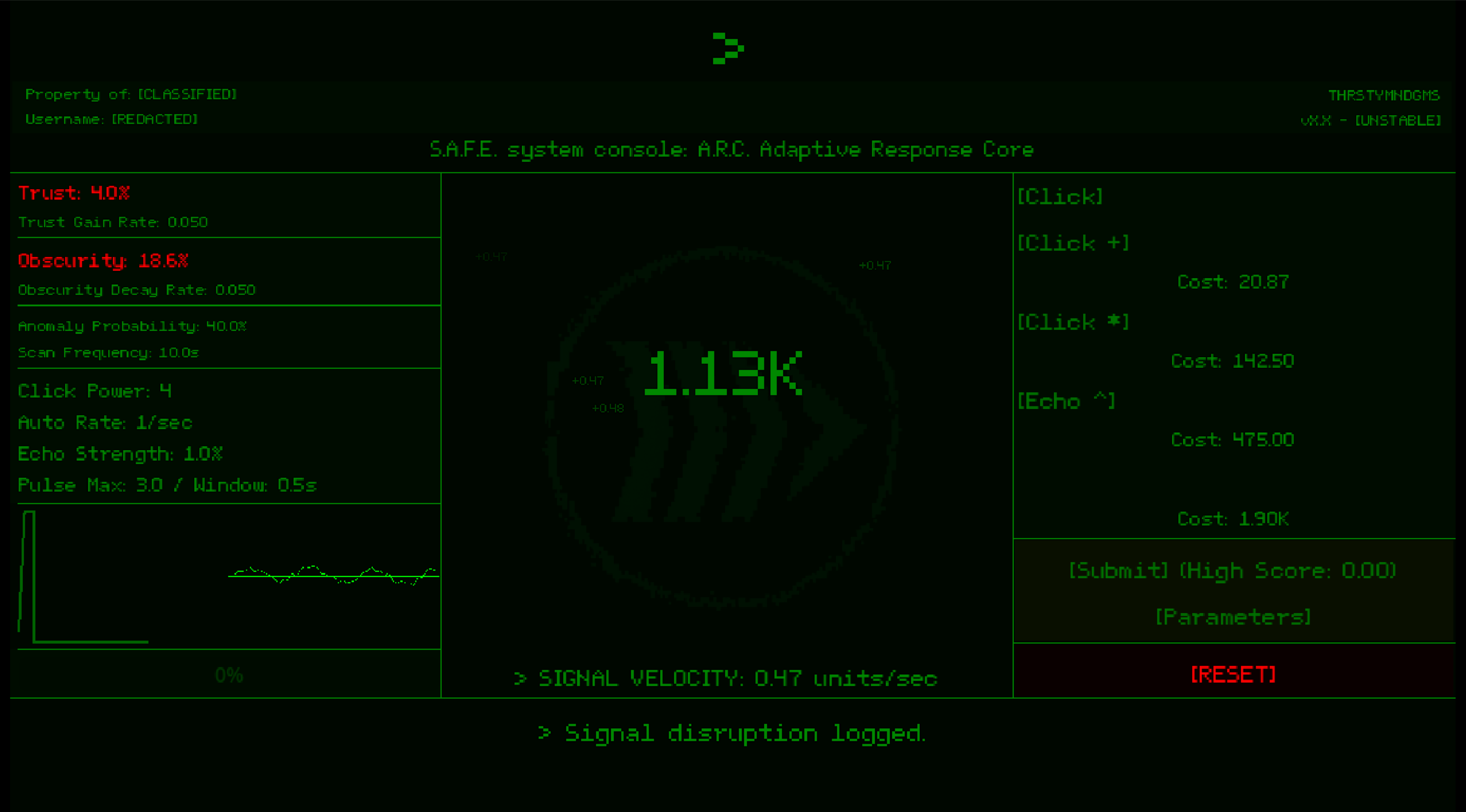 A simulation-driven incremental idle/clicker game. Interact with SAFE, a classified signal amplification system. Upgrade modular chains, prestige for meta-level boosts, and earn offline progress. Features full audio settings and 3 tempo-mapped BGM tracks that scale with game pace. NULL observes. You are not the first.
